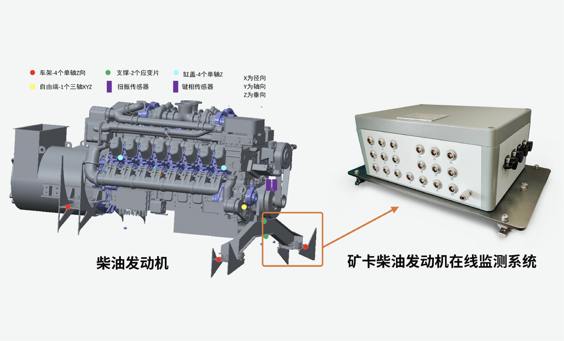 該系統(tǒng)旨在通過實(shí)時(shí)采集柴油機(jī)缸蓋、車架振動(dòng)有效值,軸架應(yīng)變,瞬時(shí)轉(zhuǎn)速波動(dòng)率,扭振振幅等數(shù)據(jù)的觀測實(shí)現(xiàn)柴油機(jī)整機(jī)振動(dòng)異常狀態(tài)、增壓器異常狀態(tài)、氣缸異常狀態(tài)的健康狀態(tài)在線診斷,為維護(hù)人員提供有價(jià)值的健康狀態(tài)監(jiān)測分析,從而實(shí)現(xiàn)降低維護(hù)成本、延長設(shè)備使用壽命的目標(biāo),提高生產(chǎn)效率。