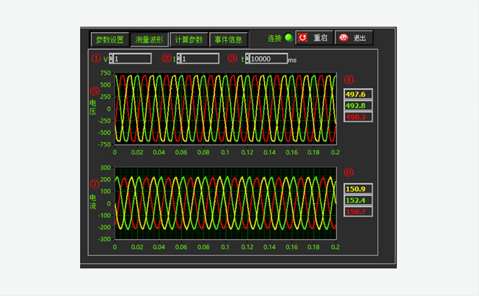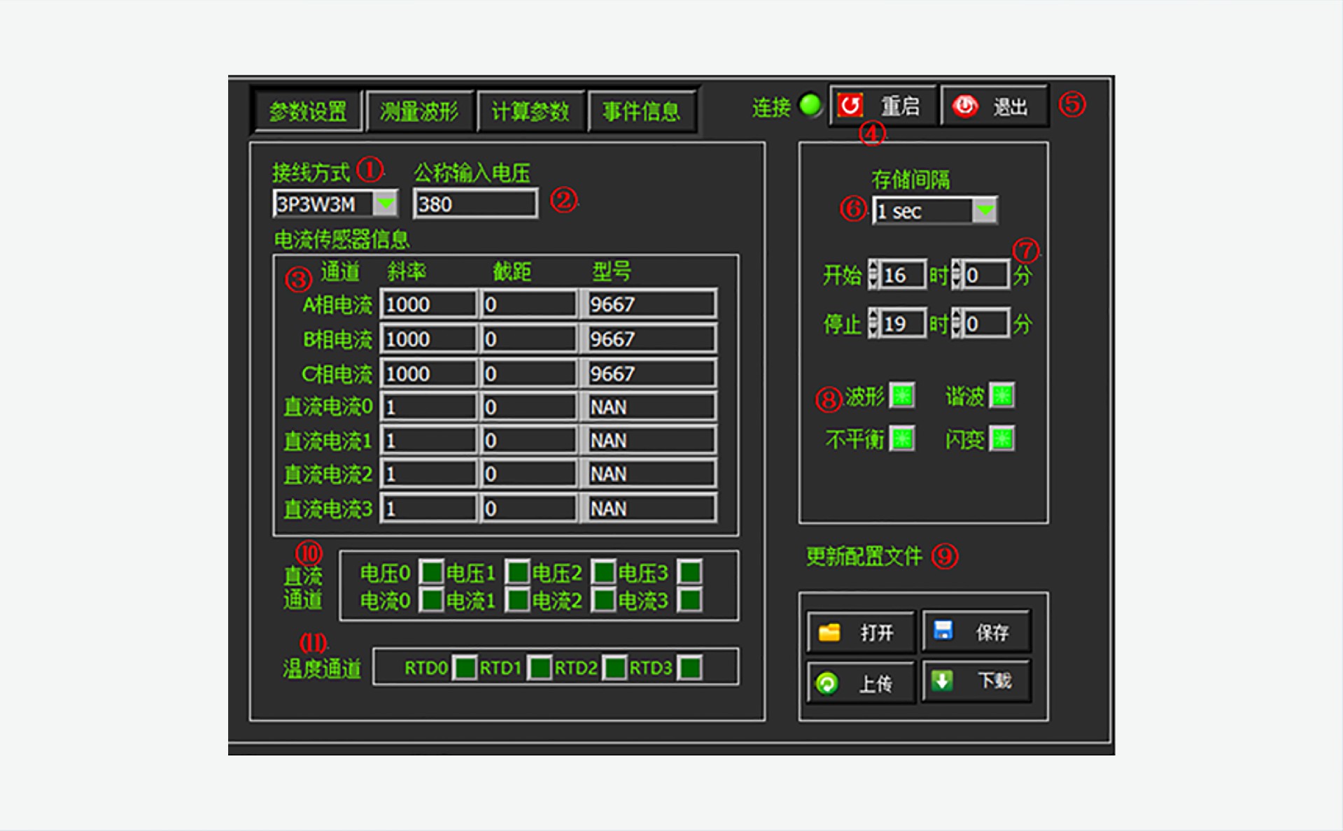 1)采集任務(wù)配置:接線方式、傳感器變比、存儲配置、通道使能等